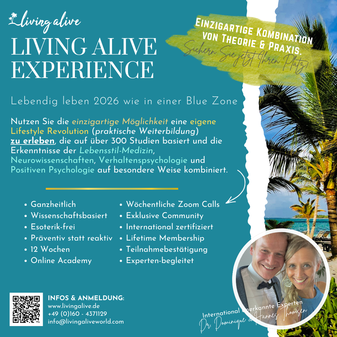Die Living Alive Experience enthält ein international anerkanntes, wissenschaftsbasiertes und erfolgreiches Lifestyle Medicine Konzept, das bereits 60,000 Menschen weltweit erreicht hat und seit 2024 nun auch im deutschsprachigen Raum, exklusiv durch Living Alive, verfügbar ist.